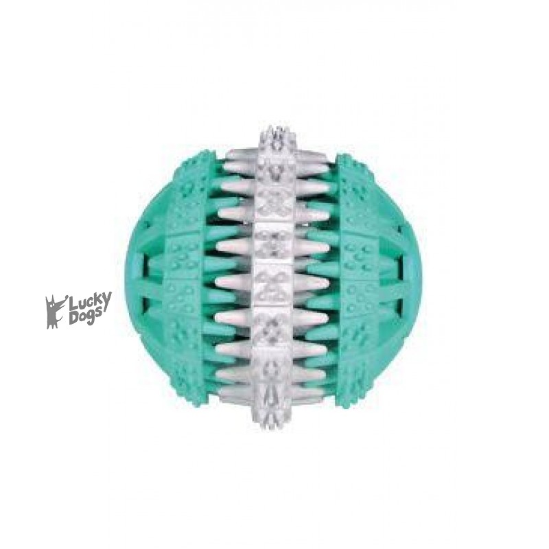 Pro zábavu, pro zdraví, pro svěží dech. To vše v jednom najdete u tohoto míčku s mátou. Speciální drážkování vyčistí zuby, mezizubní prostor, napomůže odstranění zubního kamene, posílí dásně a zároveň osvěží dech. Nemluvě o zábavě, kterou Vašemu pejsku poskytne. U štěňátek je vhodný v období přezubování, kdy svědí dásně. Do drážkování lze naskládat pamlsky a udělat z balónku interaktivní hračku. Balónek je z přírodní gumy tudíž je naprosto bezpečný a snadno omyvatelný.