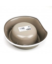 Plastová miska so zvýšeným zadným okrajom, ktorý napomáha udržať väčšiu čistotu pri kŕmení. Spodné okraje dna majú protišmykové prvky a dobre drží na drevených aj plávajúcich podlahách, linoleu i dlažbe. Miska je jednoduchá na údržbu, stačí umyť teplou vodou. Táto