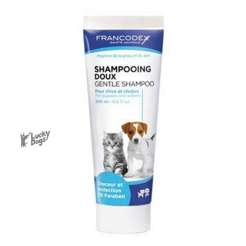 Máte doma šteniatko a potrebujete extra jemný šampón na jeho citlivú kožu? Šteniatka do pol roka veku by sa nemali vôbec kúpať a to z toho dôvodu, že ich koža je chránená špeciálnym kožným mazom, ktorý sa kúpeľom odstraňuje. V prípade, že ale potrebujete Vaše psie bábätko vykúpať, použite vždy šampón, ktorý je jemný a šetrný k ich koži - napríklad šampón Francodex. Špeciálny šampón pre šteňatá od FRANCODEX Santé Animale jemne umýva srsť a kožu šteňaťa. pH produktu je neutrálny, a preto nedráždi ani citlivú pokožku a udržuje jej prirodzenú hladinu hydratácie. Možno používať podľa potreby. Vďaka jemnej čistiace báze zostane srsť vášho šteňa mäkká a lesklá. Katiónový polymér chráni srsť vášho psa pred vonkajšími škodlivými vplyvmi.